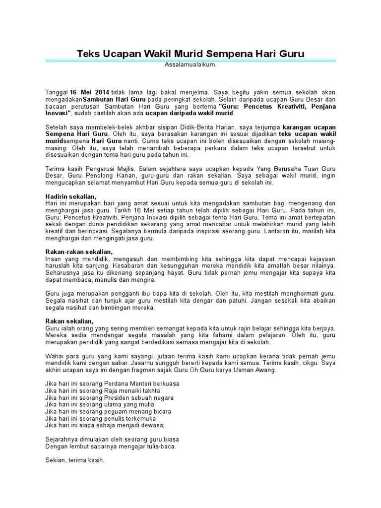 Teks ucapan wakil murid sempena hari guru terima kasih pengerusi majlis. Yang berusaha tuan haji yahya bin rakam, guru besar sk . Teks ucapan ketua pelajar sempena hari guru. Teks ucapan hari guru oleh wakil murid.